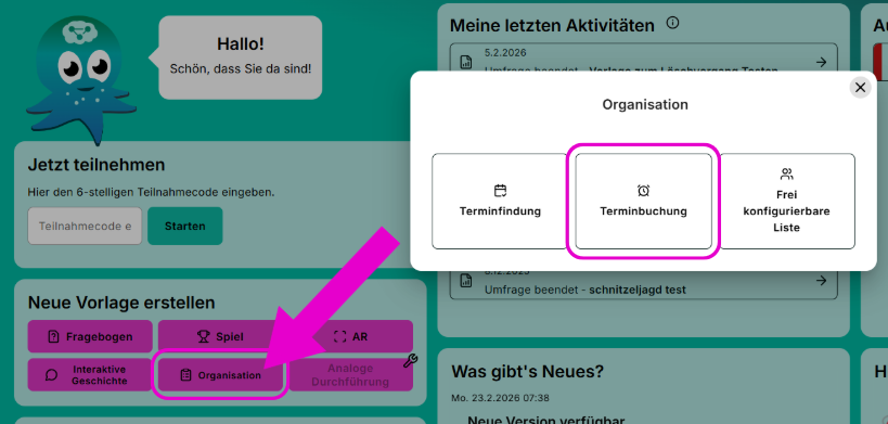 Der Button „Organisation“ > "Terminbuchung" im Bereich „Neue Vorlage erstellen“ auf dem Dashboard öffnet den Editor zur Erstellung einer Terminbuchung.