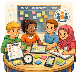 | Kurzbeschreibung: Lernende nutzen minnit′ für Planung, Terminfindung und Aufgabenverteilung und erfahren Organisation als Lernfeld für Kooperation und Selbststeuerung. Sie erleben, wie Zeit, Ressourcen und Zuständigkeiten miteinander verknüpft sind und welche Konsequenzen Entscheidungen für andere haben. Organisation wird so zu einem transparenten, reflektierten und gemeinschaftlich gestalteten Prozess. Zielgruppe: alle Schularten und Altersgruppen | Zeitbedarf variabel |